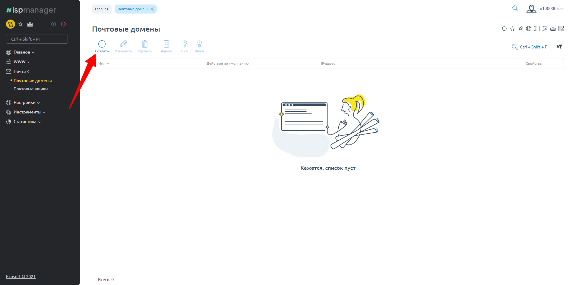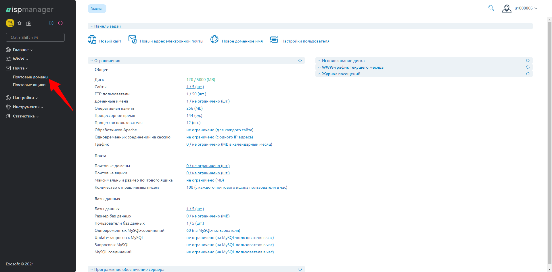 - В меню ISPmanager слева найдите раздел Почтовые домены в категории Почта.