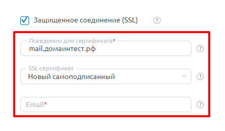 - Защищенное соединение (SSL) - включение использования защищенного соединения с почтовым доменом по протоколу SSL/TLS; если активировано, необходимо указать дополнительные параметры: