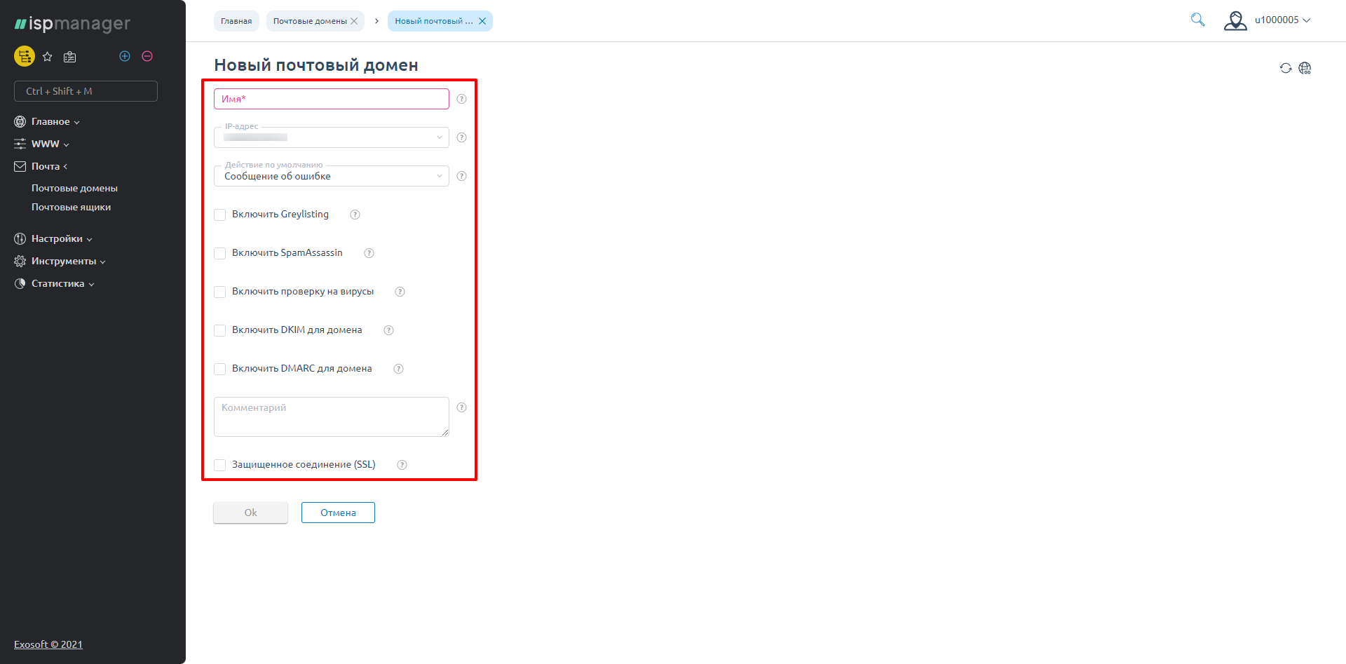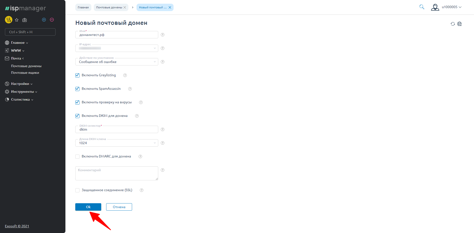 - Проверьте все внесенные данные и нажмите Ок, чтобы создать почтовый домен.