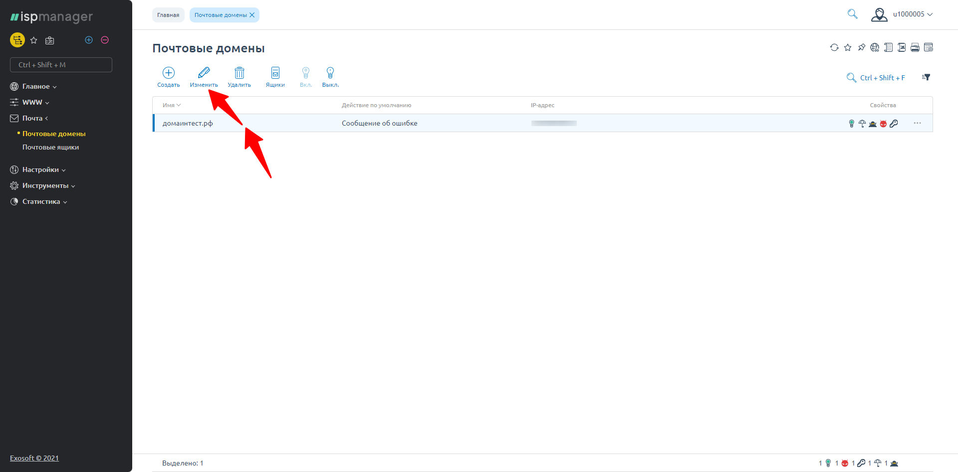 - Созданный почтовый домен отобразится в списке новой строкой. Для повторного редактирования настроек домена выделите его левой кнопкой мыши и нажмите кнопку Изменить или просто нажмите по нему дважды.